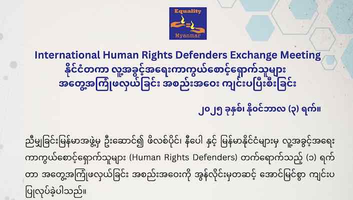 နိုင်ငံတကာ လူ့အခွင့်အရေးကာကွယ်စောင့်ရှောက်သူများ အတွေ့အကြုံဖလှယ်ခြင်း အစည်းအဝေး ကျင်းပပြီးစီးခြင်း
