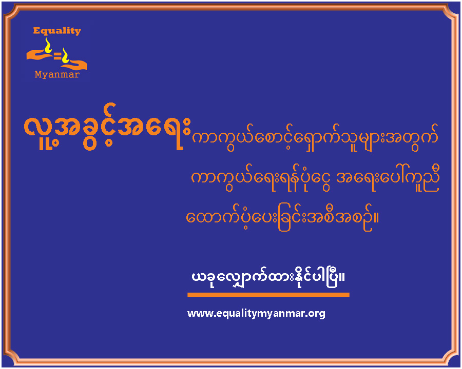 ညီမျှခြင်း မြန်မာ” သည် လူ့အခွင့်အရေး ပညာပေးအစီအစဉ်များ၊ လူ့အခွင့်အရေးချိုးဖောက်မှုများ ကို မှတ်တမ်းတင်ကာ တက်ကြွ လှုပ်ရှားသူများ၊ လူ့အခွင့် အရေး ကာကွယ်စောင့်ရှောက်သူများနှင့် ၎င်းတို့၏ မိသားစုများအတွက် အရေးပေါ် ပံ့ပိုး မှုများ ပံ့ပိုးပေးသည့် အစိုးရမဟုတ်သောအဖွဲ့အစည်း တခုဖြစ်သည်။ ထို့အပြင် ဒေသခံအရပ်ဘက်အဖွဲ့အစည်းများ၊ ပညာပေးသူများနှင့် လူ့အခွင့်အရေး တက်ကြွလှုပ်ရှားသူများ လည်းပါဝင်သည်။ ကျွန်ုပ်တို့၏ အစီအစဉ်များနှင့် လှုပ်ရှားမှု များသည် မြန်မာနိုင်ငံရှိ ပြည်နယ်နှင့် တိုင်းဒေသ ကြီးများ၌ ထိရောက်စွာ လှုပ်ရှားနိုင်ခဲ့သည်။